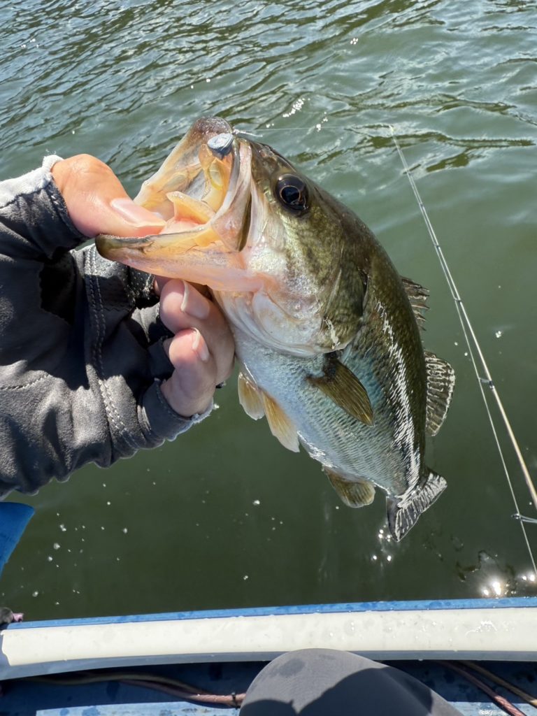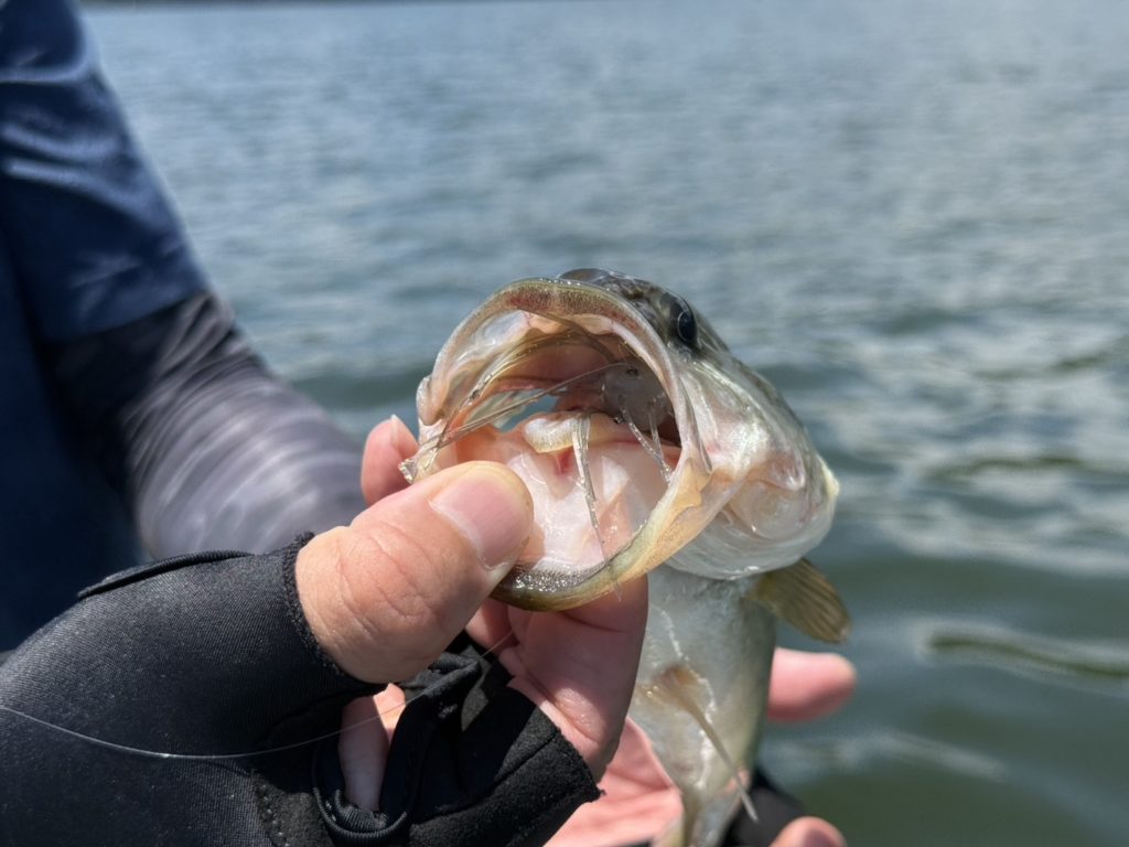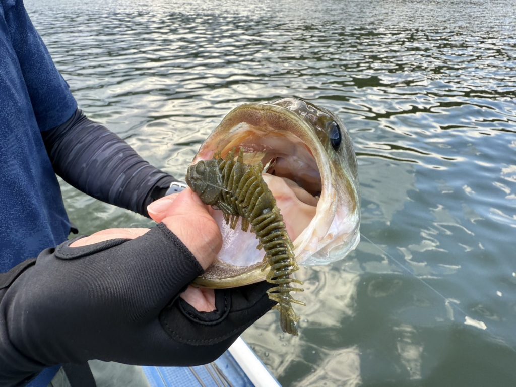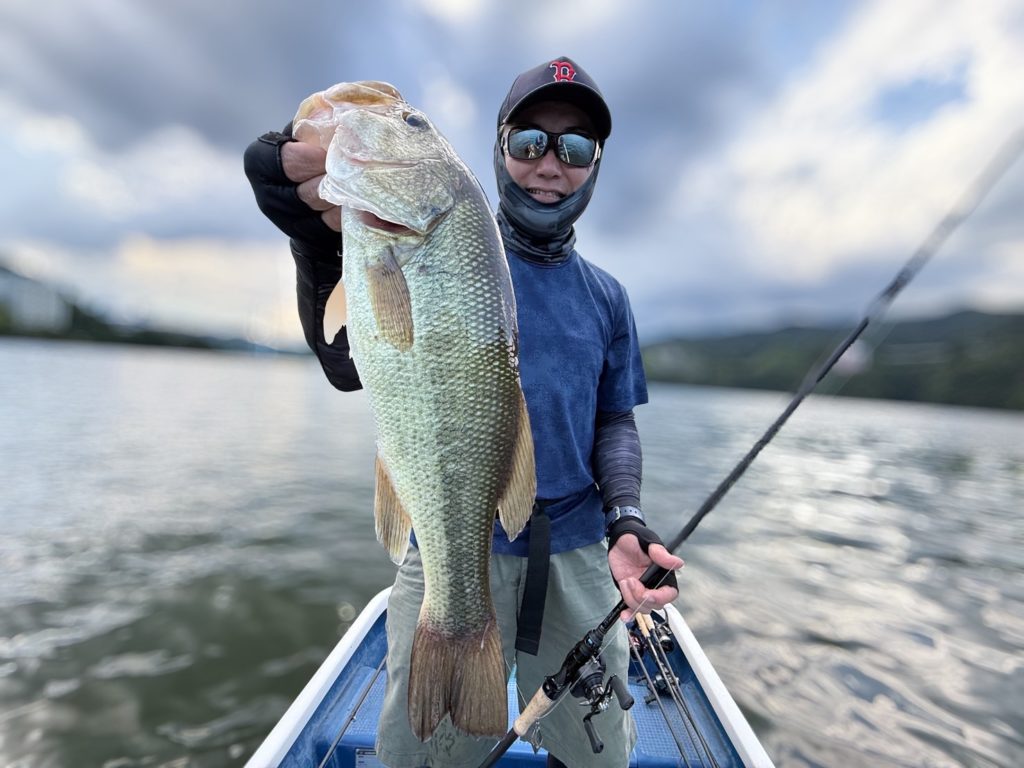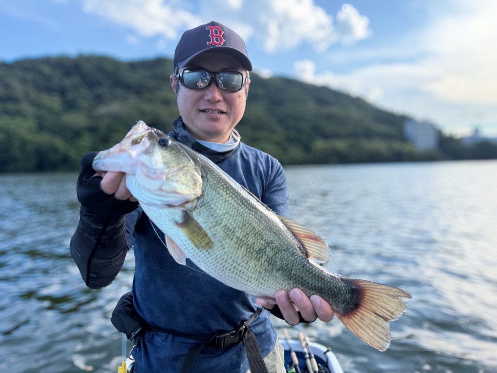 バスの魚影があるエリアを発見してルアーローテーションを行い反応がよいルアーがシュウチンガンでした。